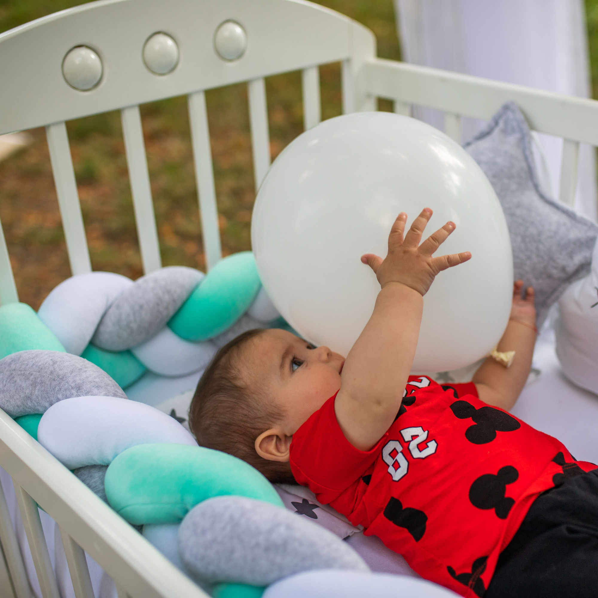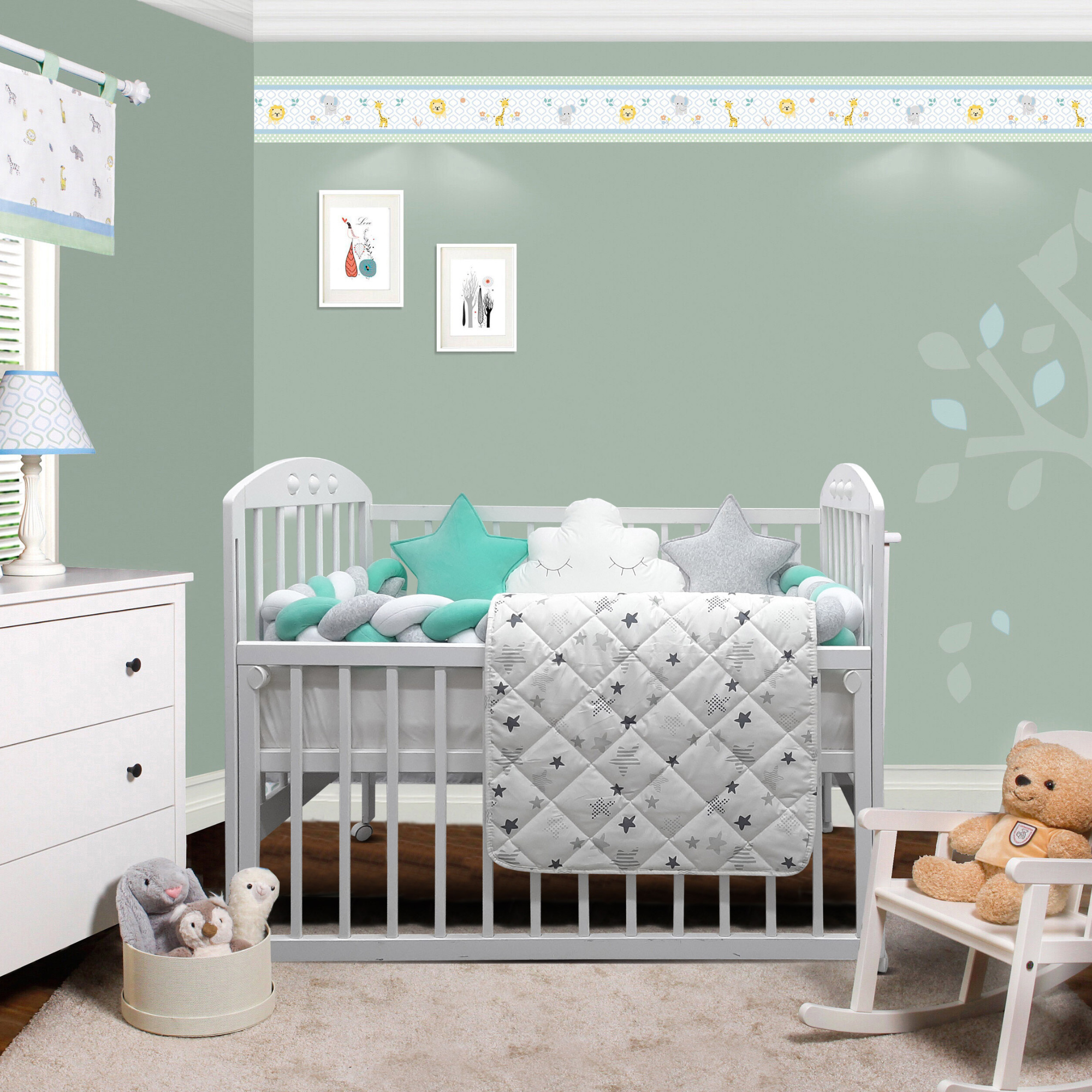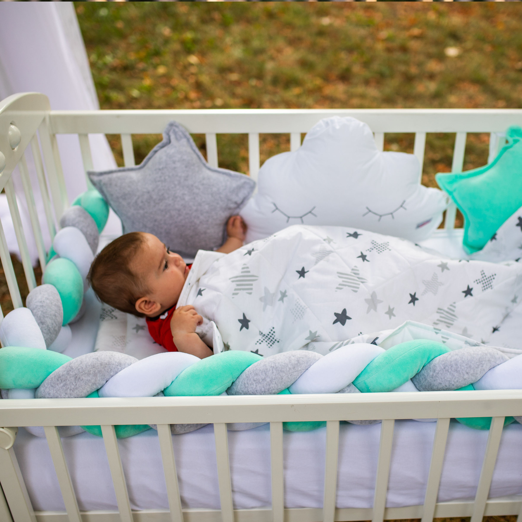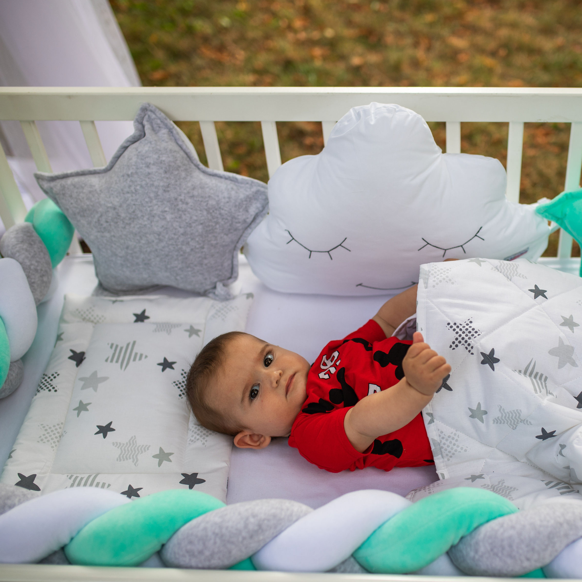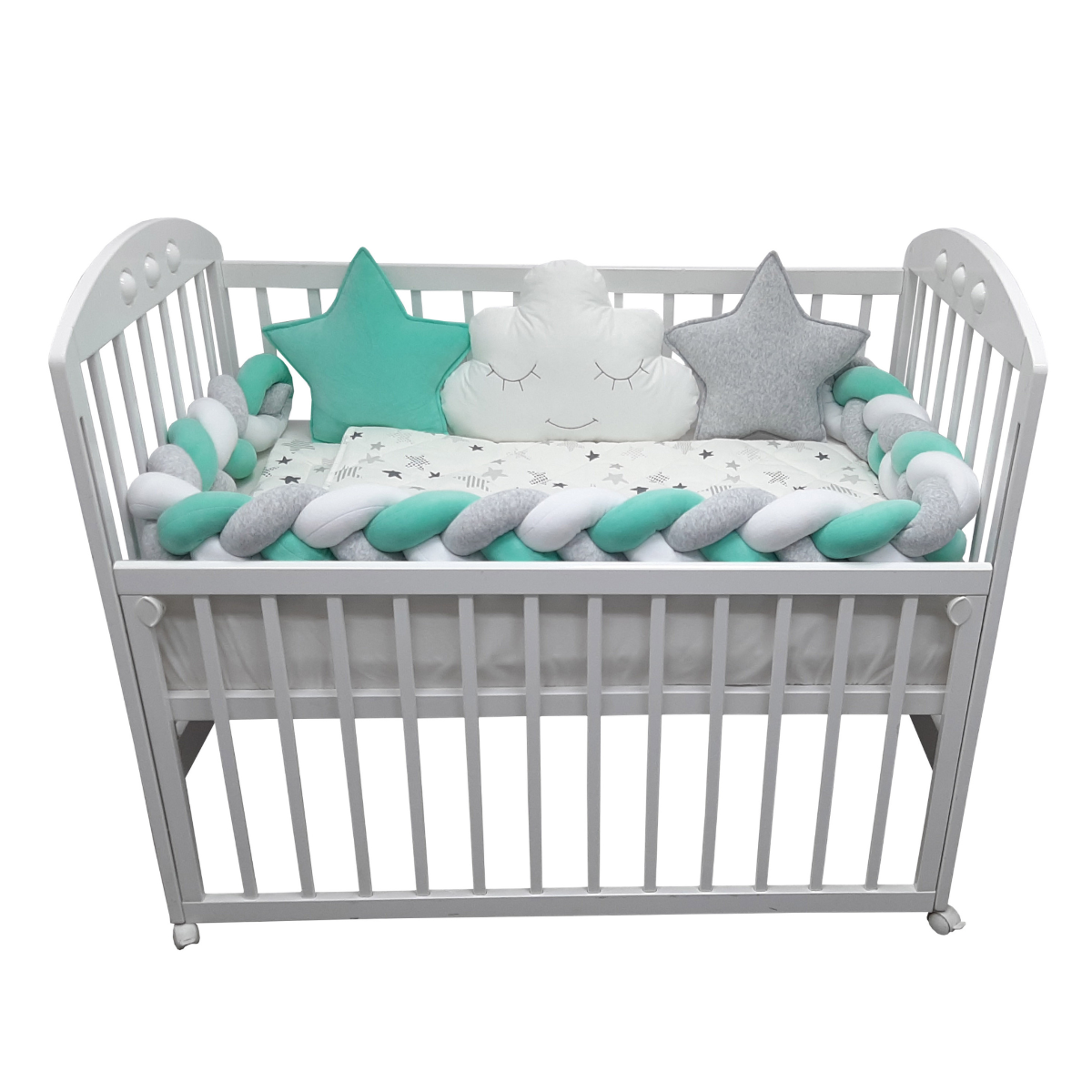 Preslatki dečiji kompleti iz kolekcije Bambino su izrađeni od pamučnog materijala sa kombinacijama koje su obožavane – pletenica + dekorativni jastučići oblak i zvezda, tako da verujemo da nećete imati dileme kod izbora. SADRŽAJ KOMPLETA: Komplet sadrži: ogradicu pletenicu dimenzije 240x15cm, 2x jastuče zvezda 40x40cm, jastuče oblak 50x40cm, jastuče 30x40cm, jorgan 90x60cm, donji čaršav dimenzije 60x120cm SIROVINSKI SASTAV: pletenica, jastučići zvezda i oblak: pamučni pliš (80%pamuk, 20%poliester), donji čaršav, jastuče i jorgan: navlaka 100% pamuk; punilo: 100% poliester