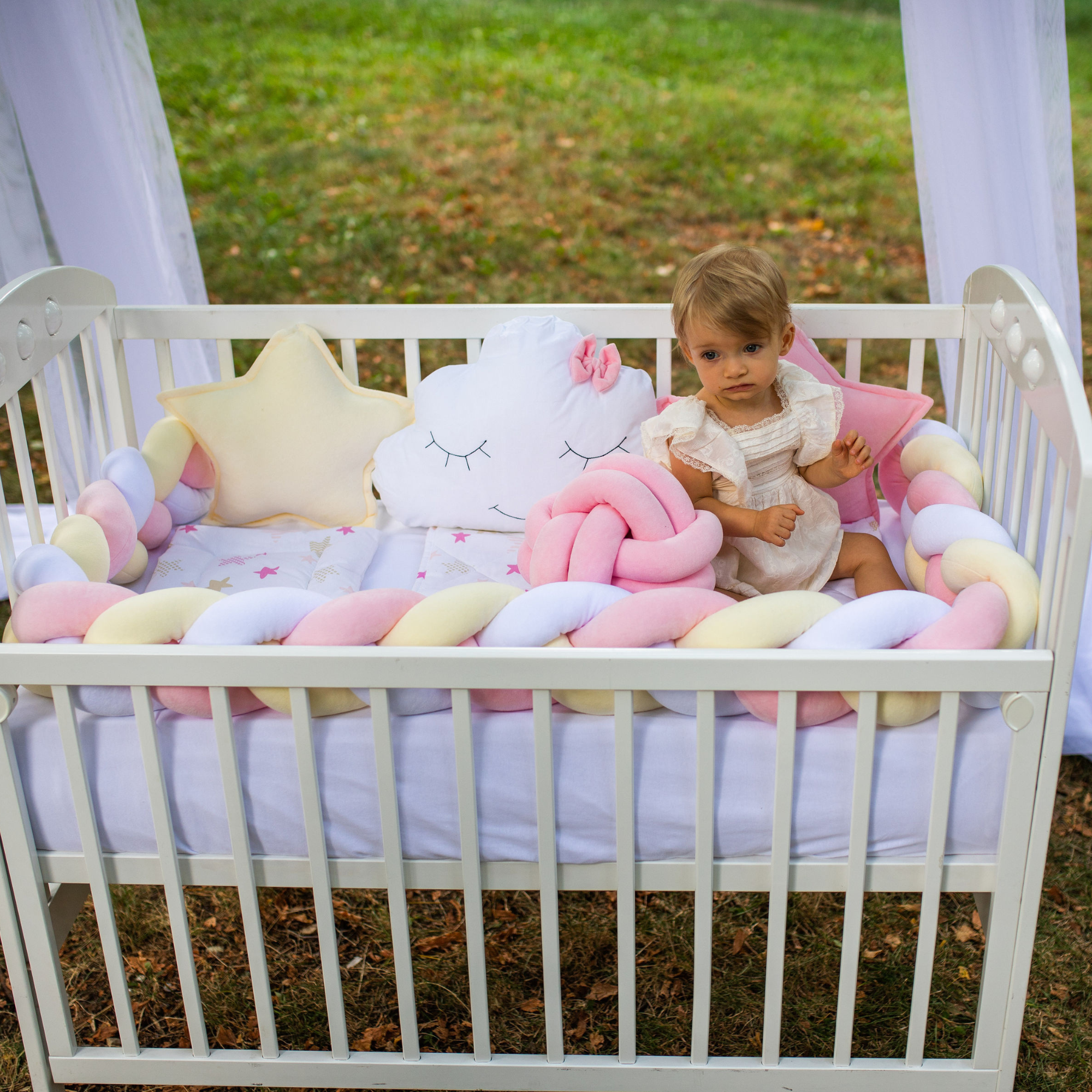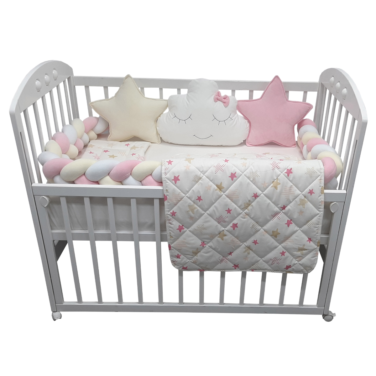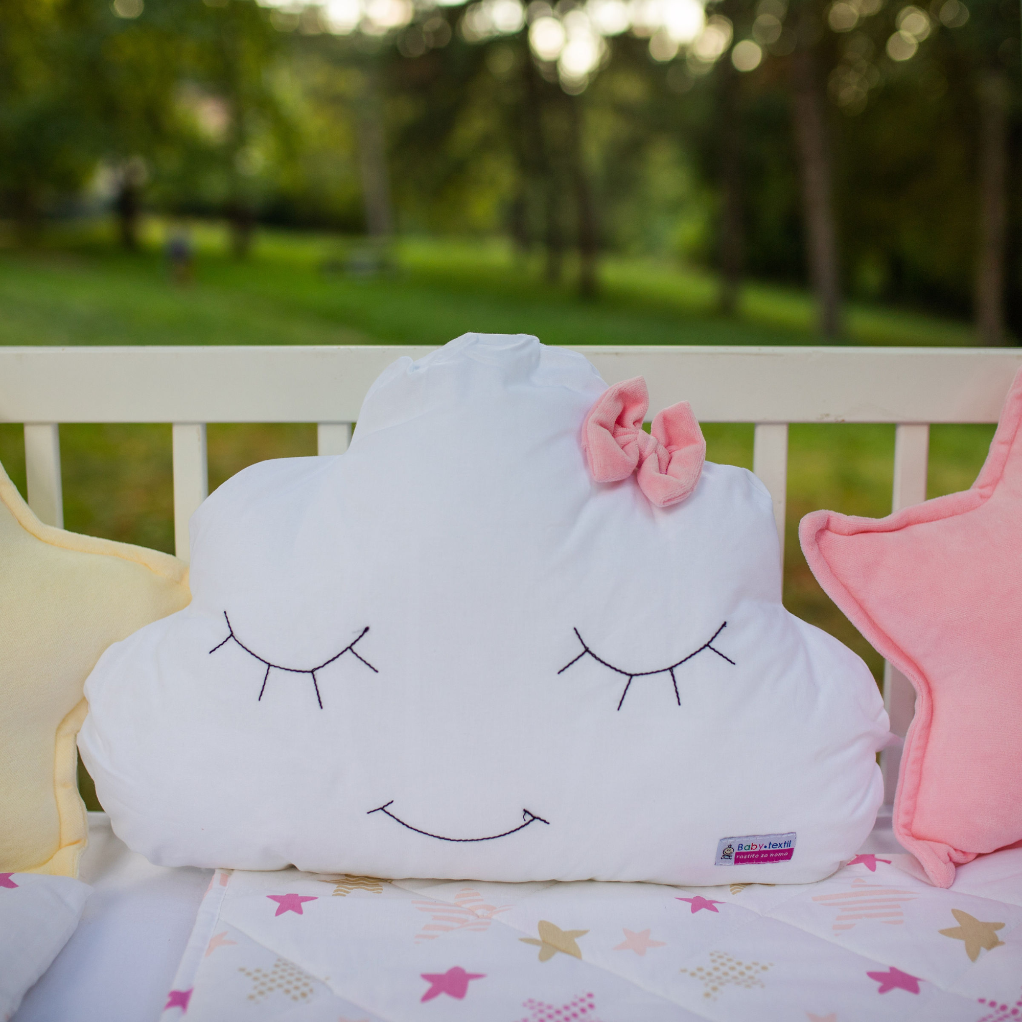 „Preslatki dečiji kompleti iz kolekcije Bambino su izrađeni od pamučnog materijala sa kombinacijama koje su obožavane – pletenica + dekorativni jastučići oblak i zvezda, tako da verujemo da nećete imati dileme kod izbora. SADRŽAJ KOMPLETA: Komplet sadrži: ogradicu pletenicu dimenzije 240x15cm, 2x jastuče zvezda 40x40cm, jastuče oblak 50x40cm, jastuče 30x40cm, jorgan 90x60cm, donji čaršav dimenzije 60x120cm SIROVINSKI SASTAV: pletenica, jastučići zvezda i oblak: pamučni pliš (80%pamuk, 20%poliester), donji čaršav, jastuče i jorgan: navlaka 100% pamuk; punilo: 100% poliester“