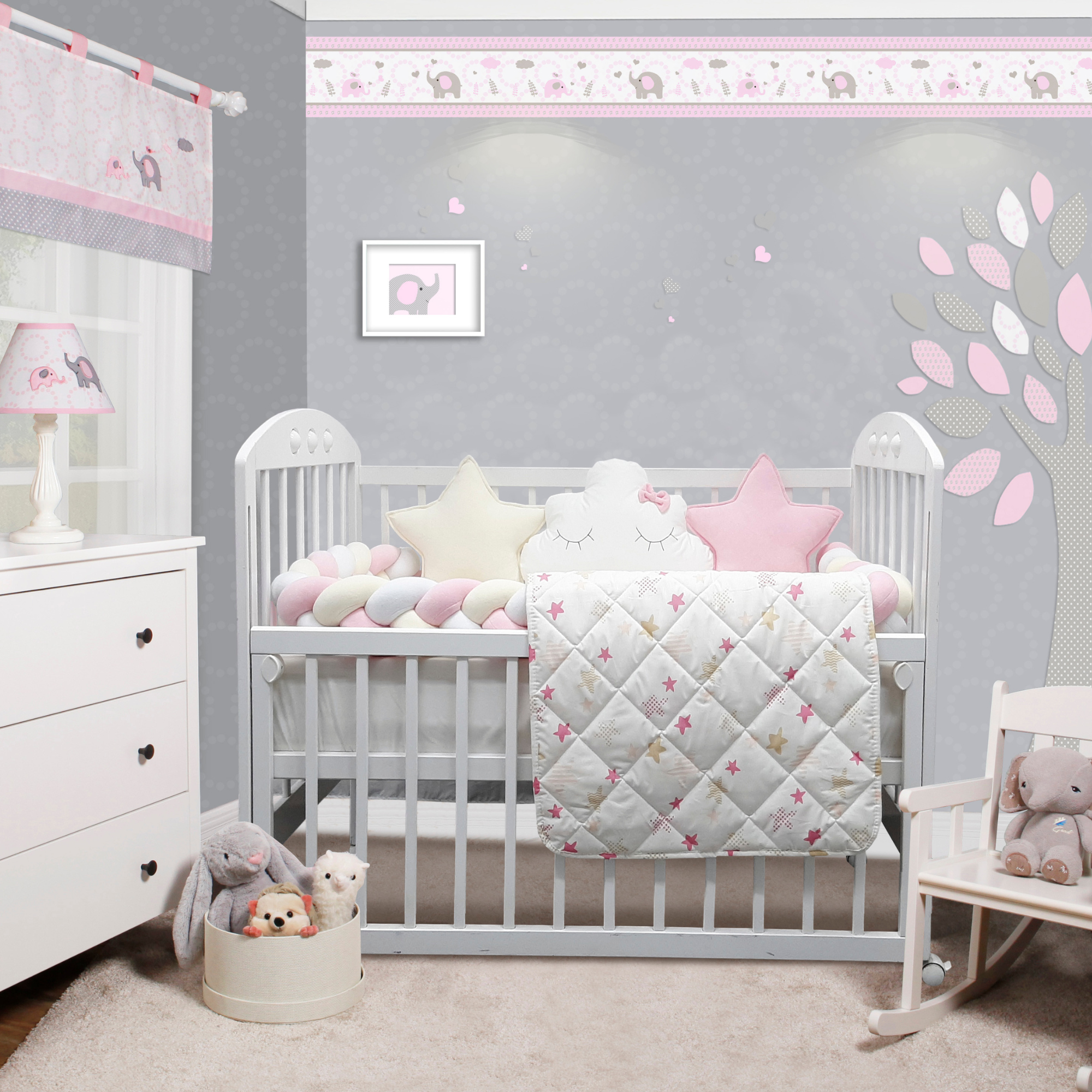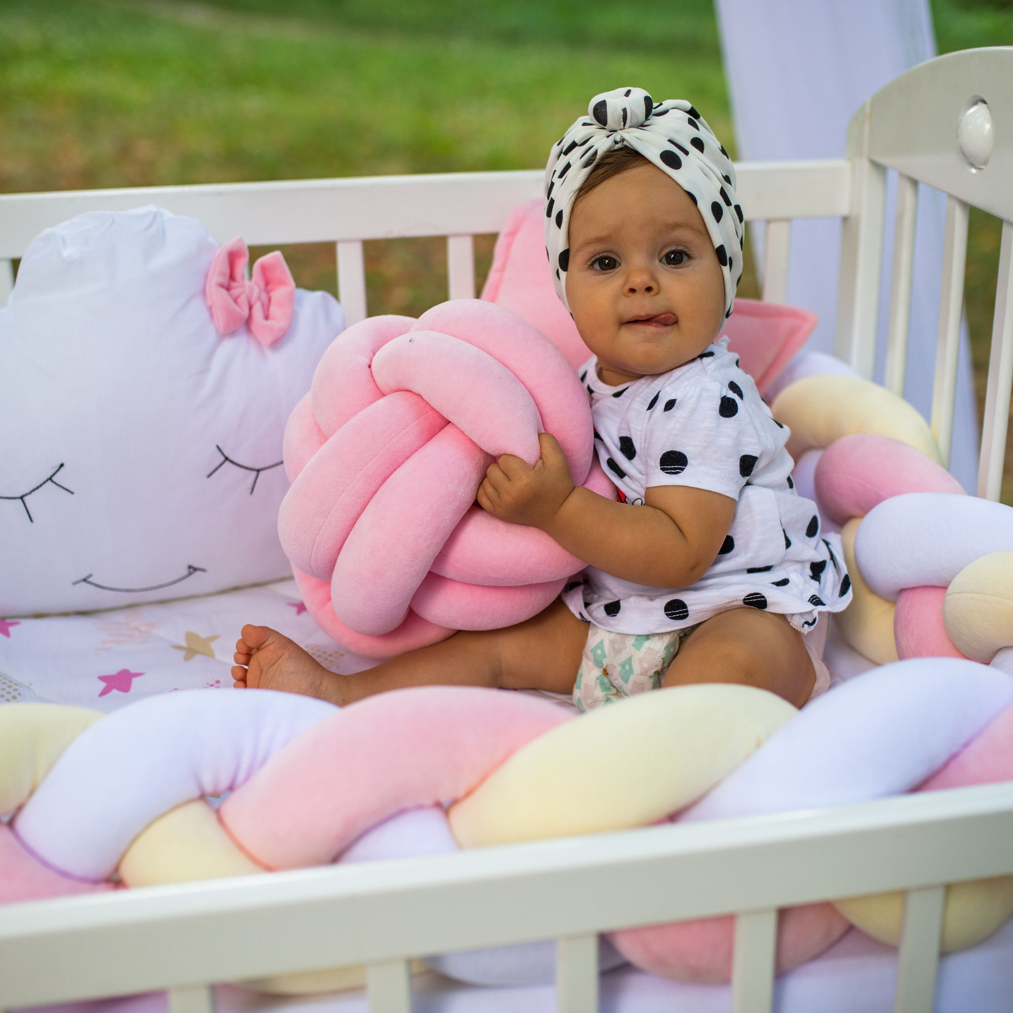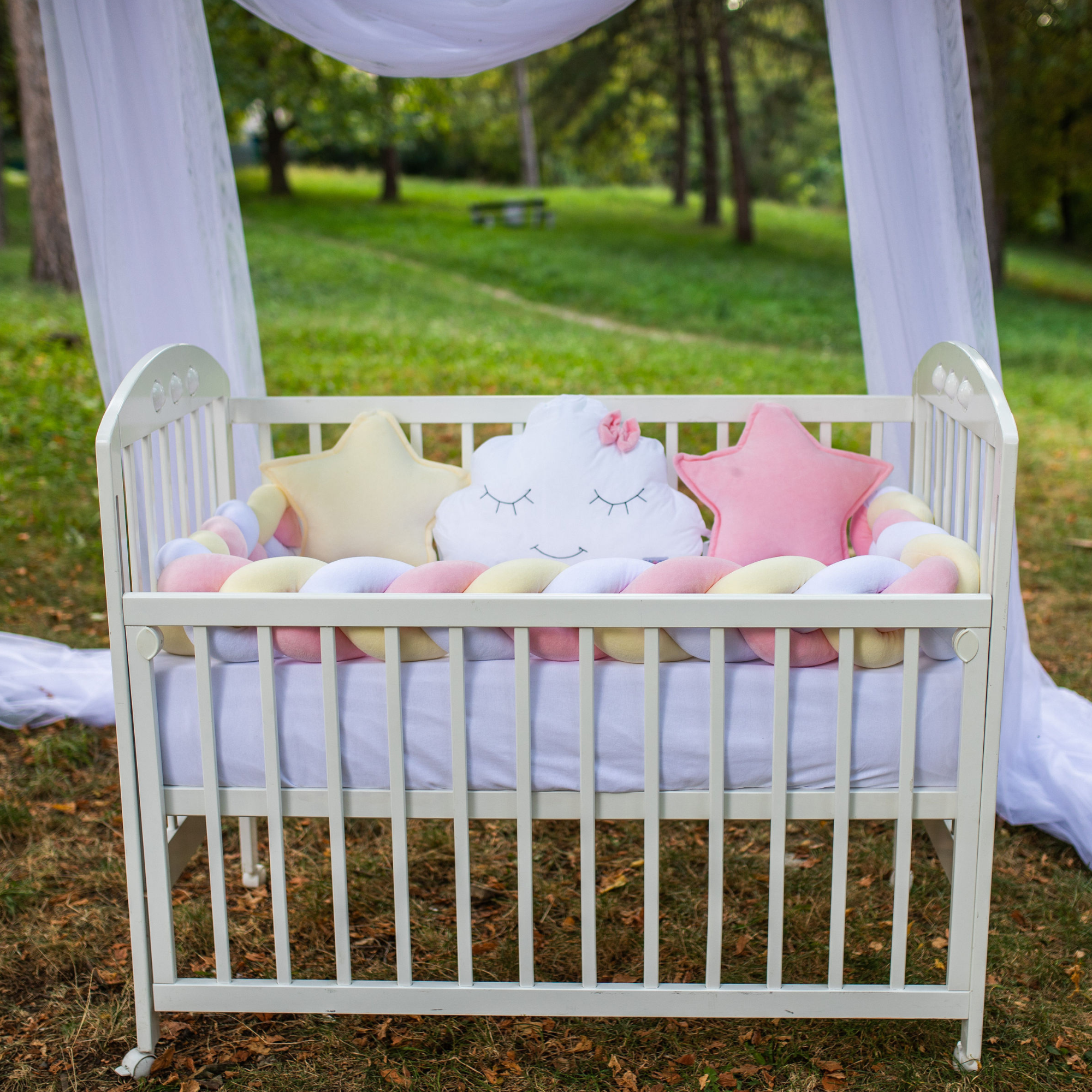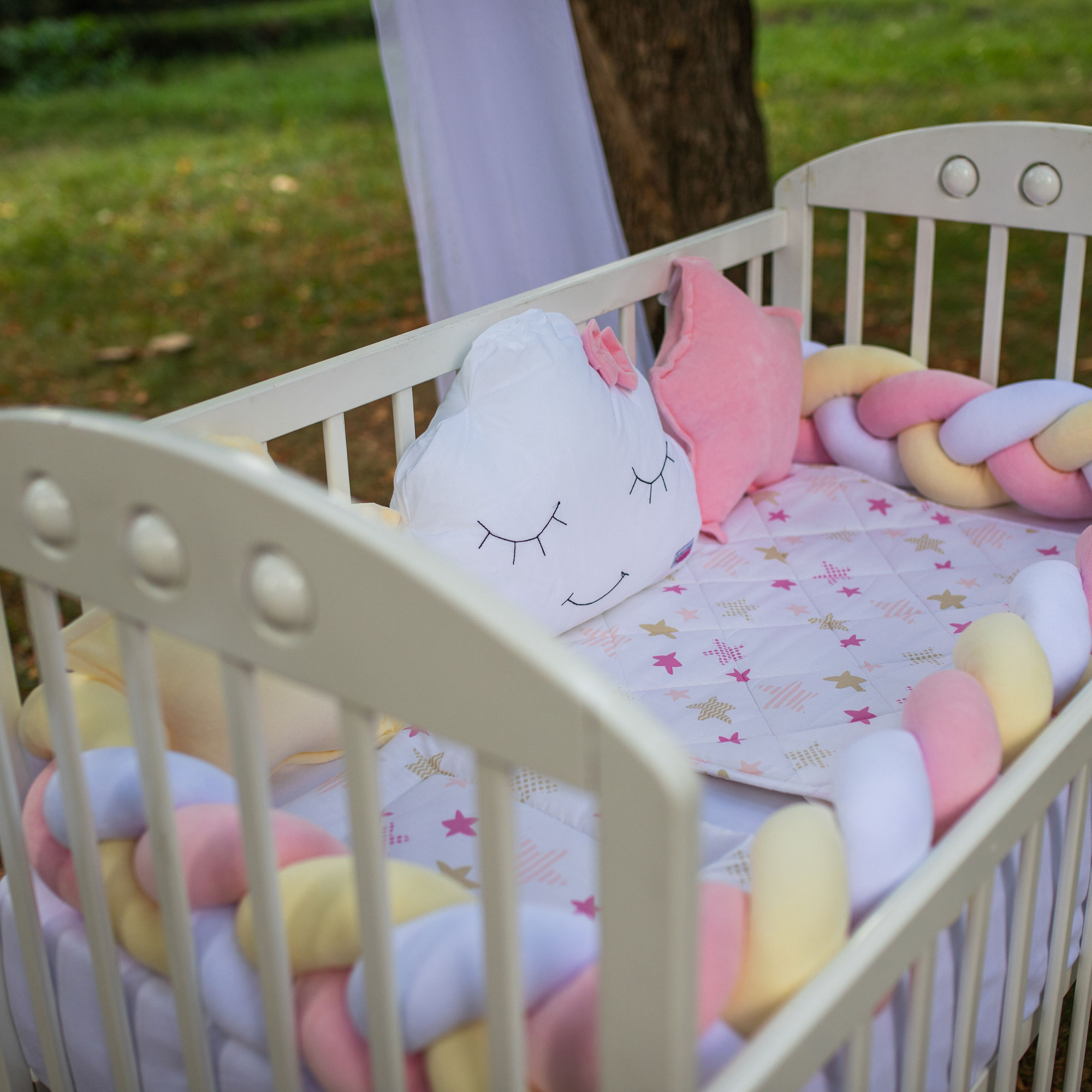 „Preslatki dečiji kompleti iz kolekcije Bambino su izrađeni od pamučnog materijala sa kombinacijama koje su obožavane – pletenica + dekorativni jastučići oblak i zvezda, tako da verujemo da nećete imati dileme kod izbora. SADRŽAJ KOMPLETA: Komplet sadrži: ogradicu pletenicu dimenzije 240x15cm, 2x jastuče zvezda 40x40cm, jastuče oblak 50x40cm, jastuče 30x40cm, jorgan 90x60cm, donji čaršav dimenzije 60x120cm SIROVINSKI SASTAV: pletenica, jastučići zvezda i oblak: pamučni pliš (80%pamuk, 20%poliester), donji čaršav, jastuče i jorgan: navlaka 100% pamuk; punilo: 100% poliester“