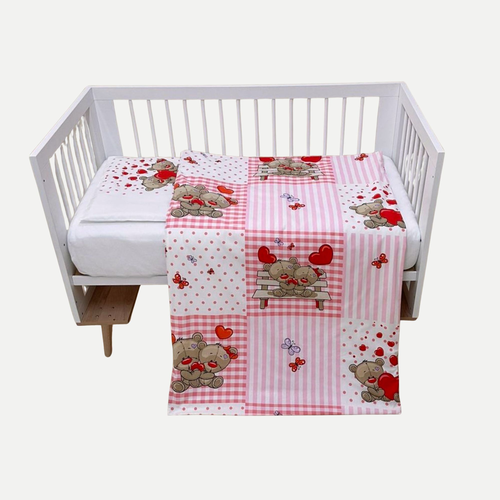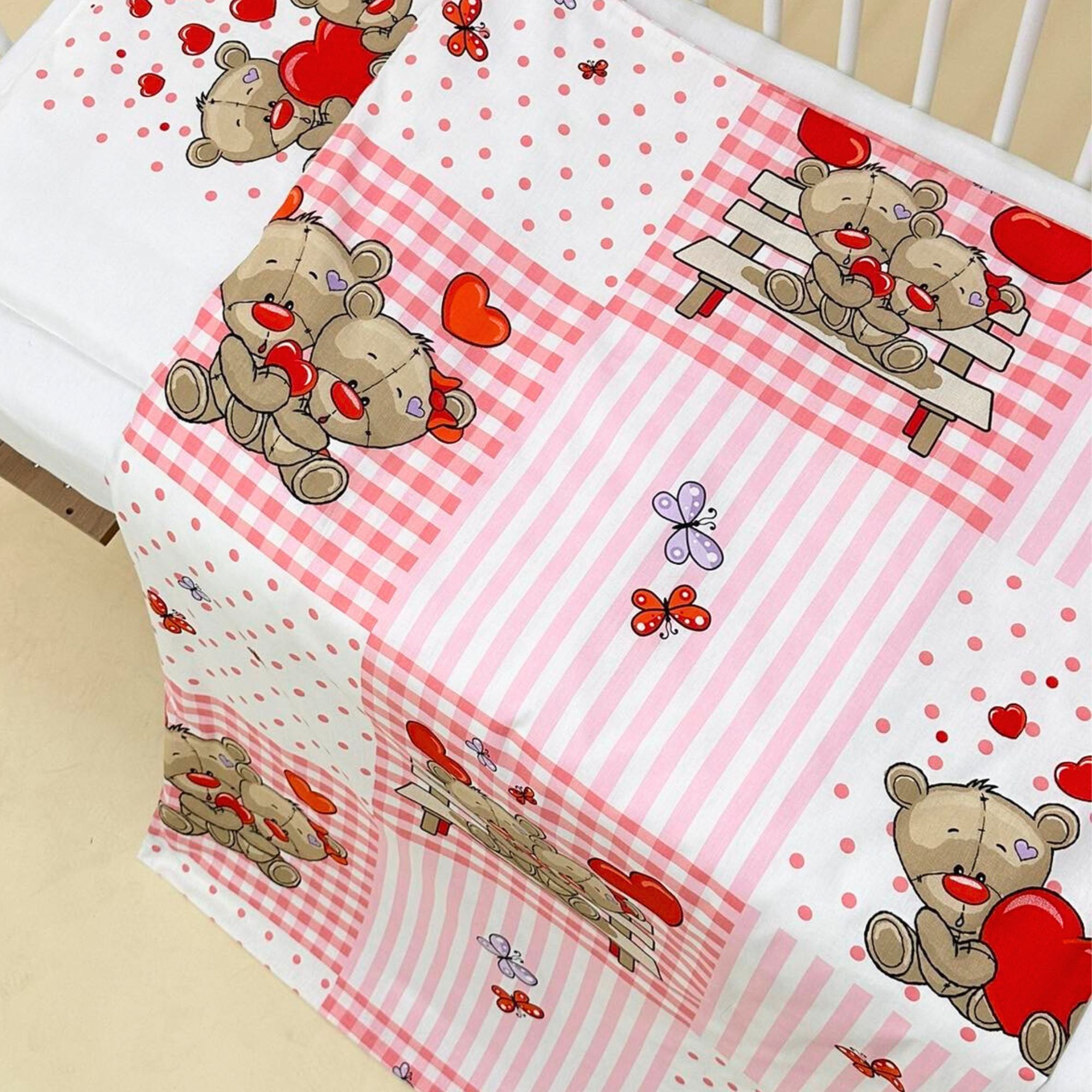 Za Vaše princeze moderan dezen sa malenim medama i leptirima. Svet meda je uvek divna ispiracija za dečije proizvode.Izgleda da sva deca vole mede. Posteljina Teddy Bear je odličan način da sobu Vaše princeze osvežite nežnim bojama i zabavanim stilom u kombinaciji sa uvek popularnim tufnama i straftama. 3100406 Bebi posteljina 80x120cm (100% pamuk) – jorganska navlaka 80x120cm – donji čaršav ravan 140x100cm – jastučnica 40x50cm